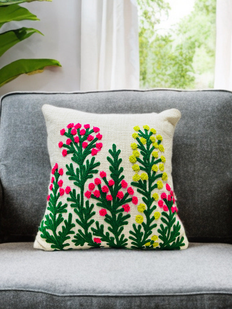 Multicolor Flower Embroidered Cushion Cover | Slub Cotton | 16x16
