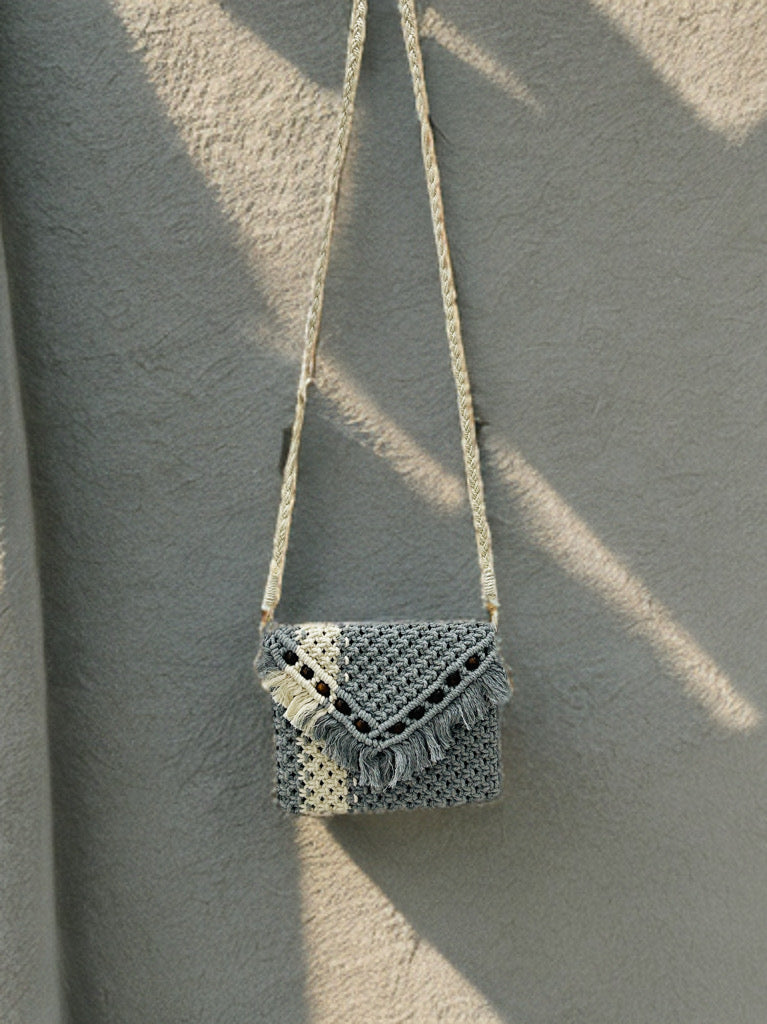 Trendy Grey Macramé Purse – Boho Beaded Sling Bag